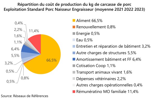 Pour un système type et exploitation standard, le coût de production moyen est composé principalement par l’alimentation à 66,5 % et la rémunération de la main d’œuvre familiale à 11.4%.