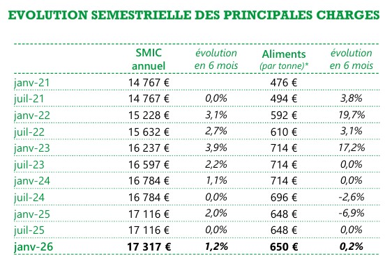 Compte tenu de leur poids dans la constitution du coût de production, ces deux charges sont suivi et mis à jour tous les semestres. Par rapport à juillet 2025, le SMIC (main d’œuvre) augmente de 1,2 % et le prix des aliments augmente faiblement de 0,2 %.