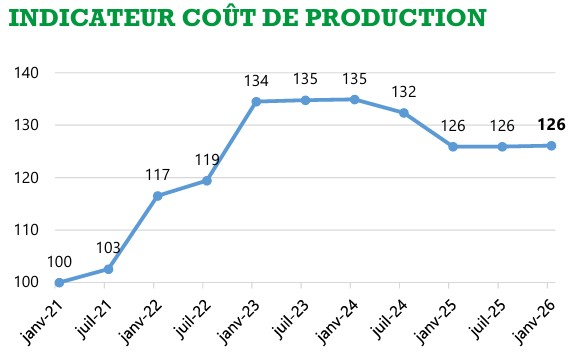 Le coût de production est stable depuis janvier 2025, après avoir connu une forte augmentation entre janvier 2021 et janvier 2023, puis une baisse jusqu’à janvier 2025.
