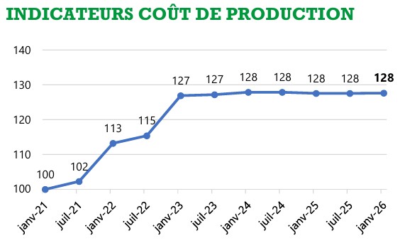 Le coût de production est plus ou moins stable janvier 2023, après avoir connu une forte augmentation de 27% entre 2021 et 2023.