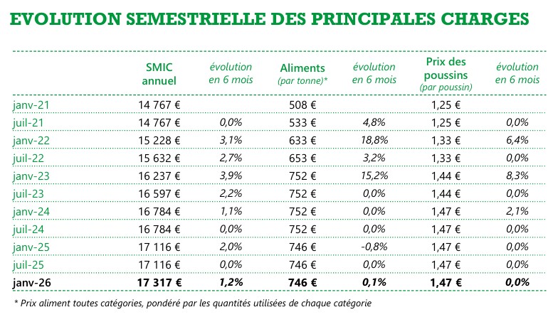 Ces trois principales charges sont suivi et mis à jour tous les semestres. Par rapport au semestre dernier, seul le SMIC, c’est à dire la charge de main d’œuvre, a augmenté de 1,2 % contrairement à l’achat des poussins et l’alimentation qui sont restés stables.
