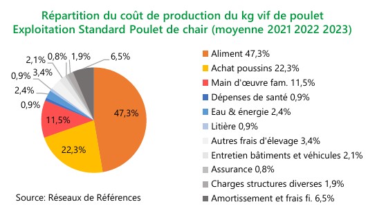 En moyenne, pour une exploitation standard de Poulet de chair, le coût de production du kg de vif de poulet est constitué principalement à 47,3 % de l’alimentation, de 22.3 % de l’achat de poussins et 11.5% de main d’œuvre familiale (SMIC).